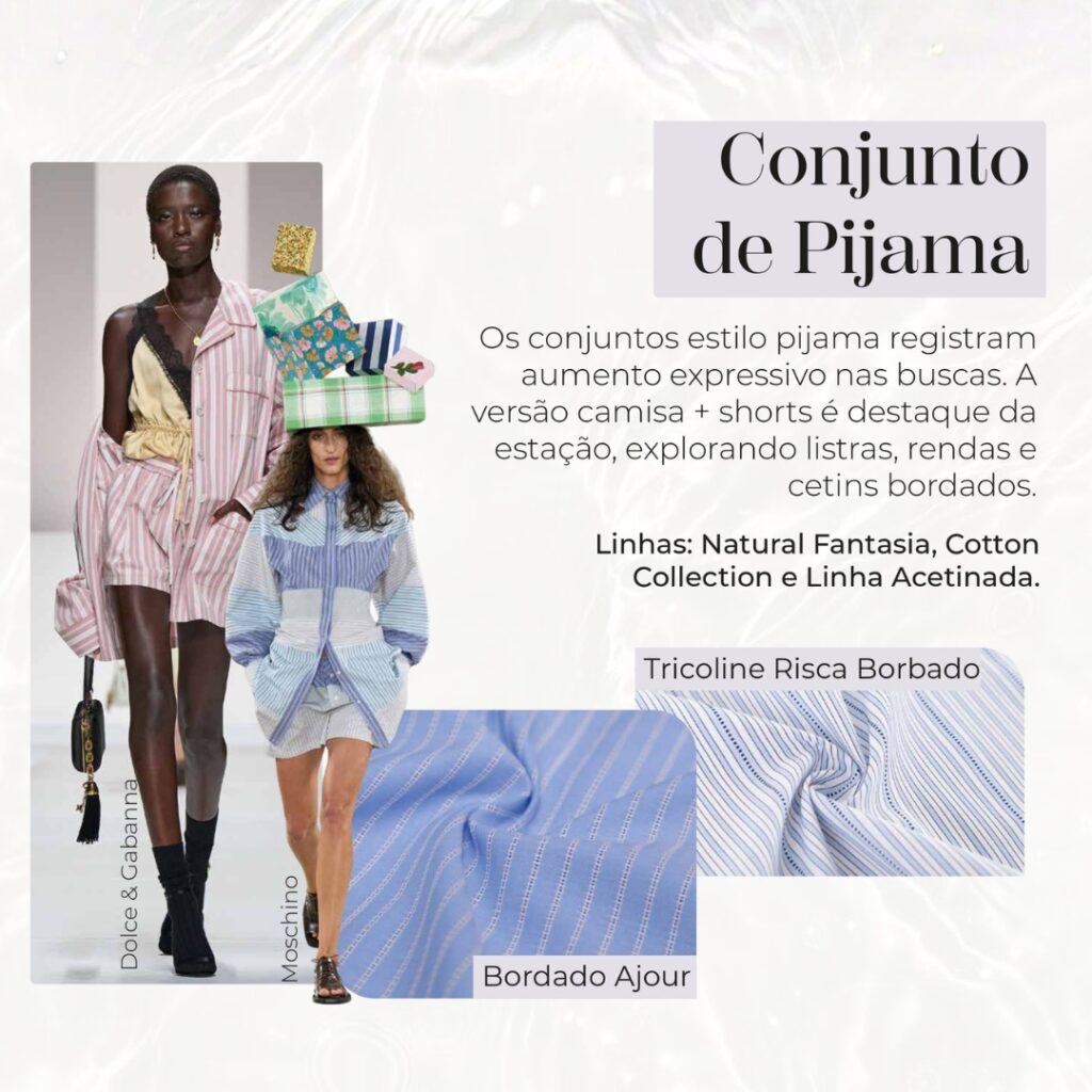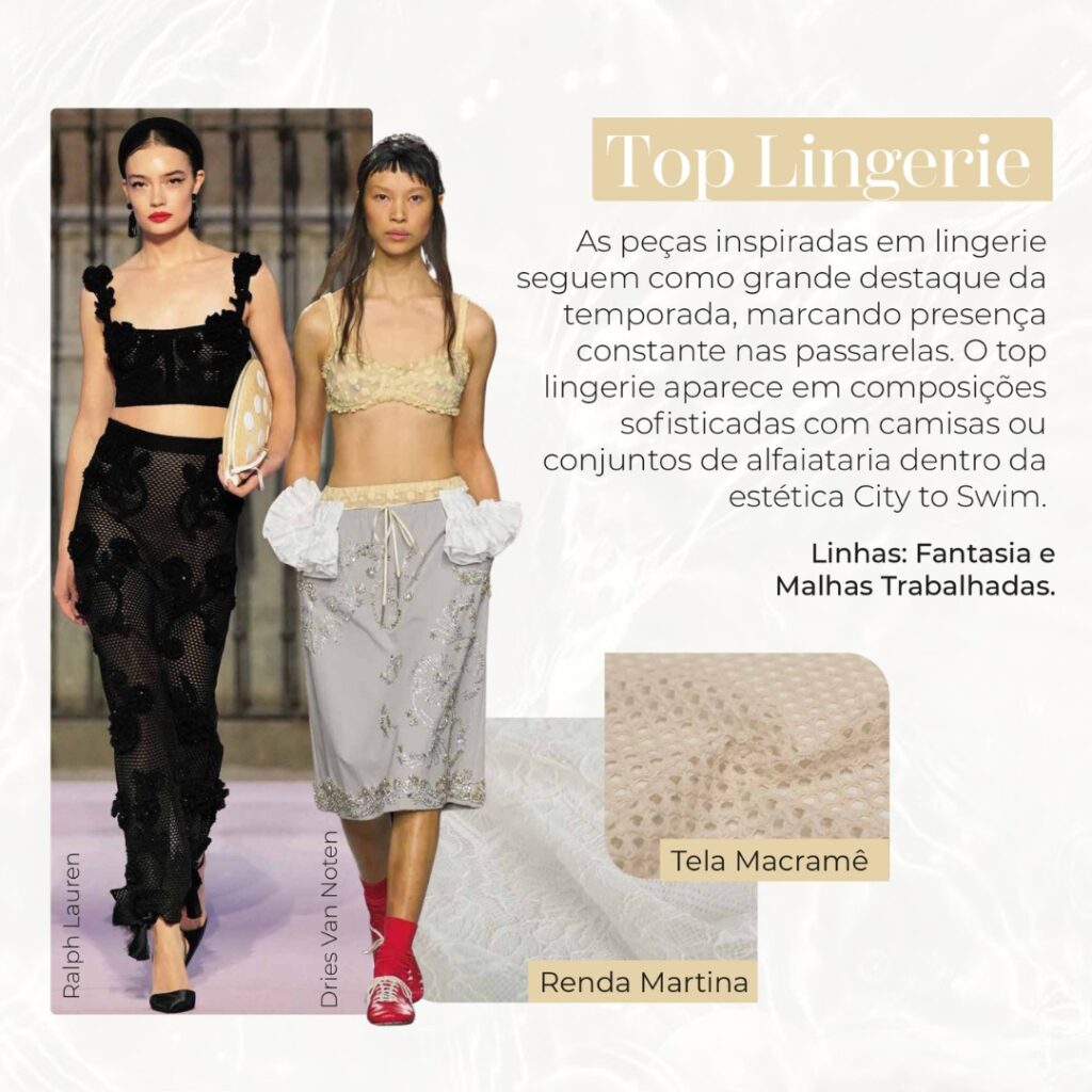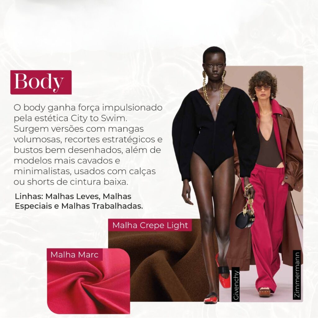 O top lingerie surge em composições mais sofisticadas com alfaiataria, enquanto o body ganha novas proporções com mangas marcantes, recortes e versões mais cavadas. Já a blusa lenço reforçam a leveza da estação com assimetrias e tecidos fluidos, transitando com facilidade entre o casual e o mais elaborado.