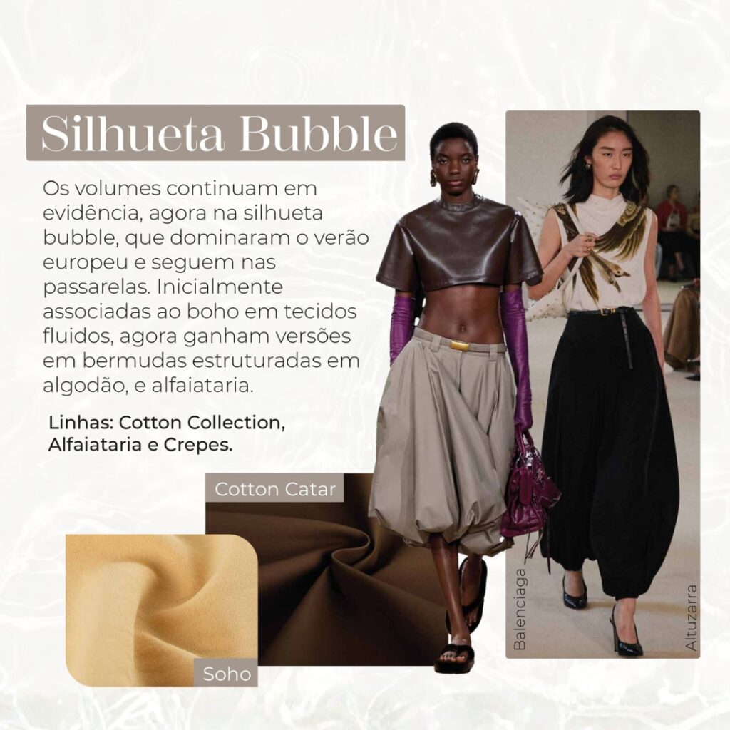 As silhuetas ganham destaque a partir do contraste entre volume e leveza. A calça bubble segue em evidência, agora também em versões mais estruturadas, enquanto a calça capri retorna com força trazendo um ar nostálgico dos anos 2000. O mini shorts acompanha essa mudança de proporção e aparecem em produções que equilibram peças amplas na parte de cima, criando um visual moderno e descomplicado.
