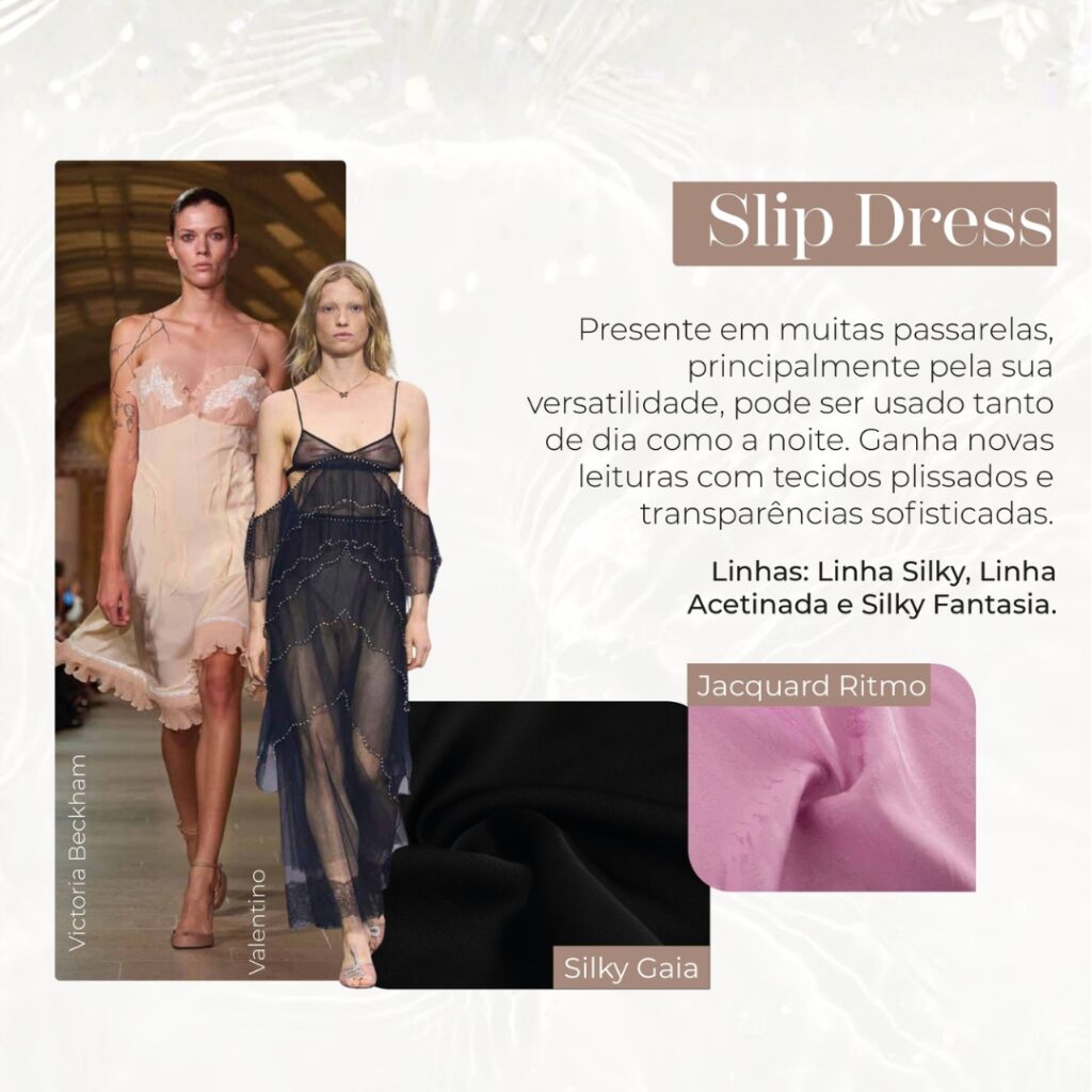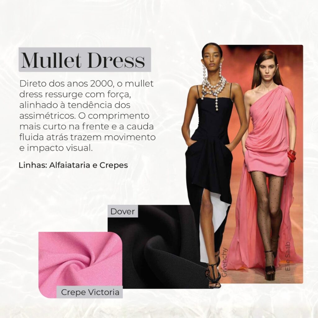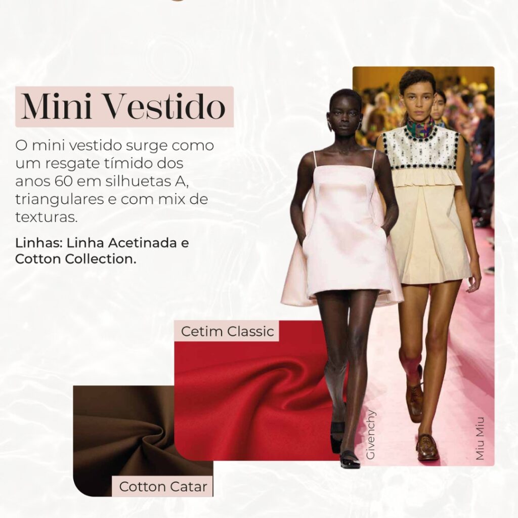 Os vestidos exploram movimento e versatilidade, com destaque para o slip dress, que transita entre diferentes ocasiões com novas texturas e transparências. O mullet dress ressurge com sua silhueta assimétrica e fluida, trazendo impacto visual, enquanto o mini vestido traz referência dos anos 60 em shapes mais simples e estruturados, reforçando uma feminilidade leve e atual.