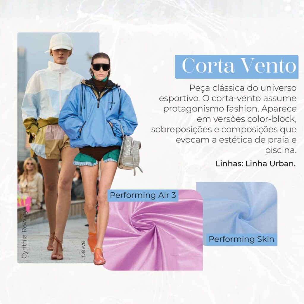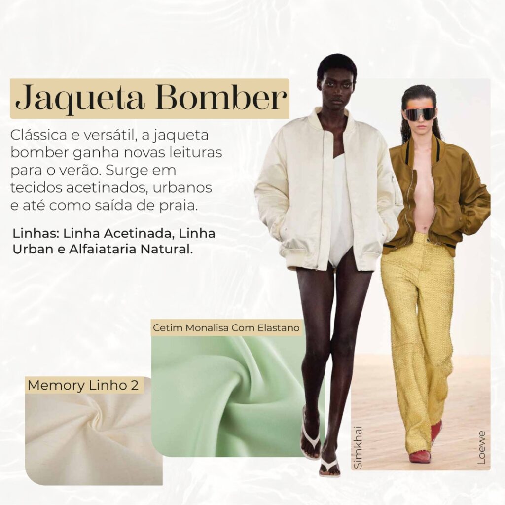 Na sobreposição, peças com apelo confortável e esportivo ganham novas leituras. Os conjuntos de pijama aparecem renovados em versões coordenadas, enquanto o corta-vento assume um papel mais fashion dentro de produções urbanas. A jaqueta bomber acompanha esse movimento, surgindo em materiais mais leves e versáteis, ampliando seu uso para além do casual.